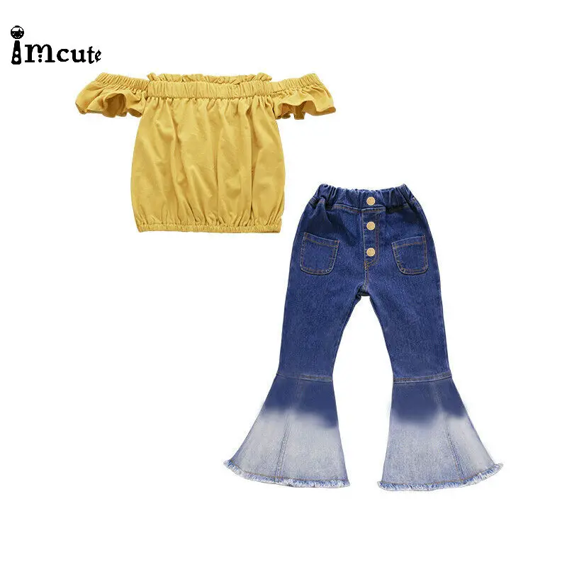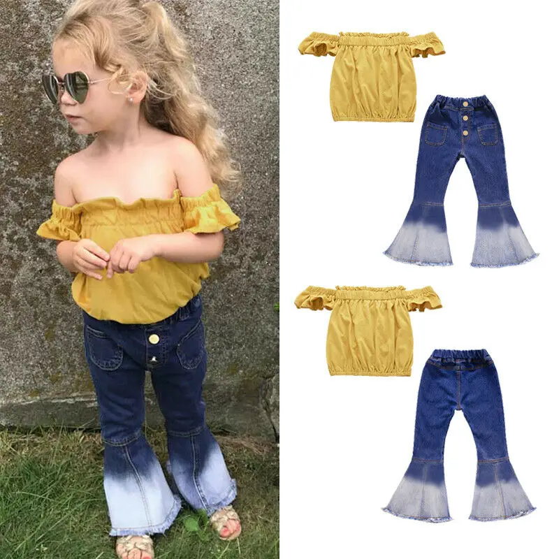 Buy 2Pcs Newborn Infant Toddler Kids Baby Girls Solid Off Shoulder Tops Denim Long Pants Flares Jeans 2 Right Here and Right Now Just for USD US $5.15, Price will be rise up at any time without notification and I cant guaranted that the stock is still available tommorow or next hour. So Please Save It Now!