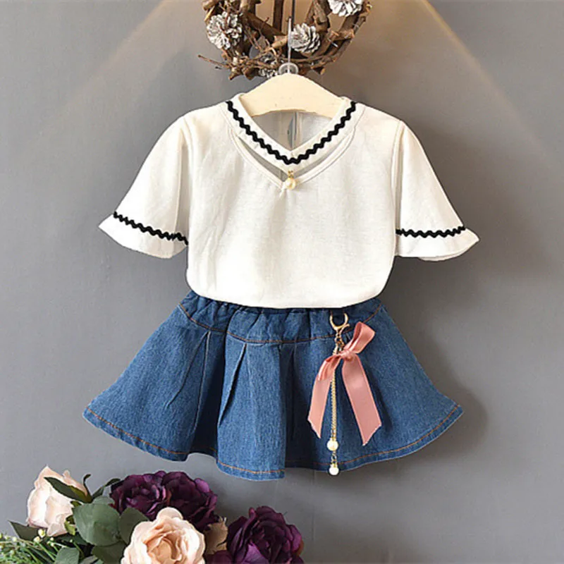 Good Chance for New 2019 Baby Girl Clothing Set Short Sleeve V-neck T-shirt+Jeans Skirt 2pcs Korean Princess Party